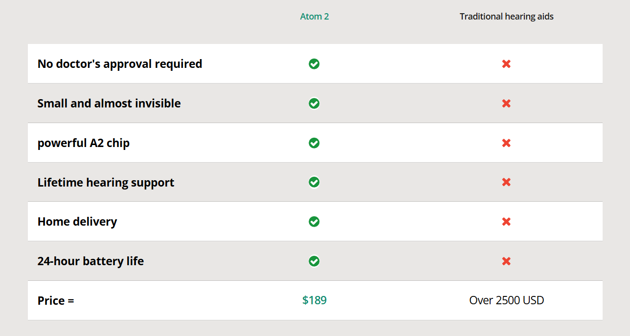 Our hearing aids are designed to address mild to moderate hearing loss. The Atom 2's advanced A2 chip delivers excellent amplified sound, reduces harshness, and provides up to 24 hours of continuous sound on a single charge.Most importantly, we sell directly to you, without any middlemen. Therefore, you don't need to pay for doctor visits, hearing tests, or bulky, outdated prescription hearing aids!You will hear everything you want to hear all day long (and nothing you don't want to hear)!